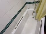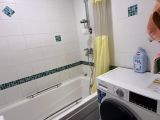Санузел раздельный, оформлен в светлых тонах с акцентами в виде плитки. В ванной комнате установлена современная сантехника и стиральная машина.